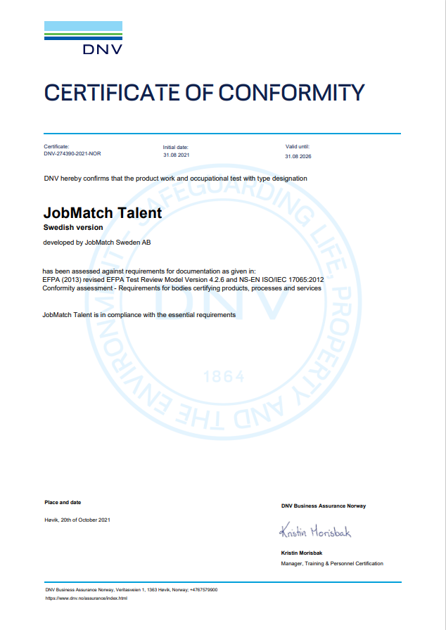 Både JobMatch Talent og JobMatch LogiQ er certificeret af DNV. Certificeringen betyder, at testene opfylder deres formål og at de er videnskabeligt dokumenteret til at være pålidelige og nøjagtige. DNV beskriver ligeledes, hvordan testene kan bruges, så både købere og leverandører kan forstå deres formål. JobMatch Talent var den første test i Sverige, der blev certificeret af DNV efter de nye retningslinjer fra European Federation of Psychologists' Associations (EFPA).
